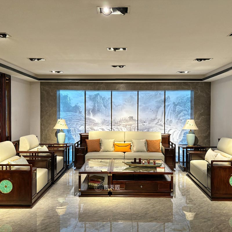 यह खूबसूरत नई चीनी शैली का सॉलिड वुड सोफा बड़े लिविंग रूम के लिए आदर्श है। इसे चुआंटियांजियांग रेडवुड फैक्ट्री द्वारा सावधानीपूर्वक तैयार किया गया है और यह उत्कृष्ट गुणवत्ता के साथ कीमती आबनूस से बना है। यह एक फर्श पर खड़ा मॉडल है, और समग्र आकार लोगों को भव्यता और विलासिता की भावना देता है। चौड़े आर्मरेस्ट का डिज़ाइन न केवल सुंदर है बल्कि व्यावहारिक भी है। मोटी मुलायम गद्दी बैठने को नरम और आरामदायक महसूस कराती है, और उस पर बैठते समय ऐसा महसूस होता है जैसे उसे धीरे से लपेटा गया हो। लक्ज़री पत्थर का उपयोग अंतिम स्पर्श है, जो सोफे की विलासिता को तुरंत बढ़ाता है और लिविंग रूम में एक चमकदार और शानदार माहौल जोड़ता है।